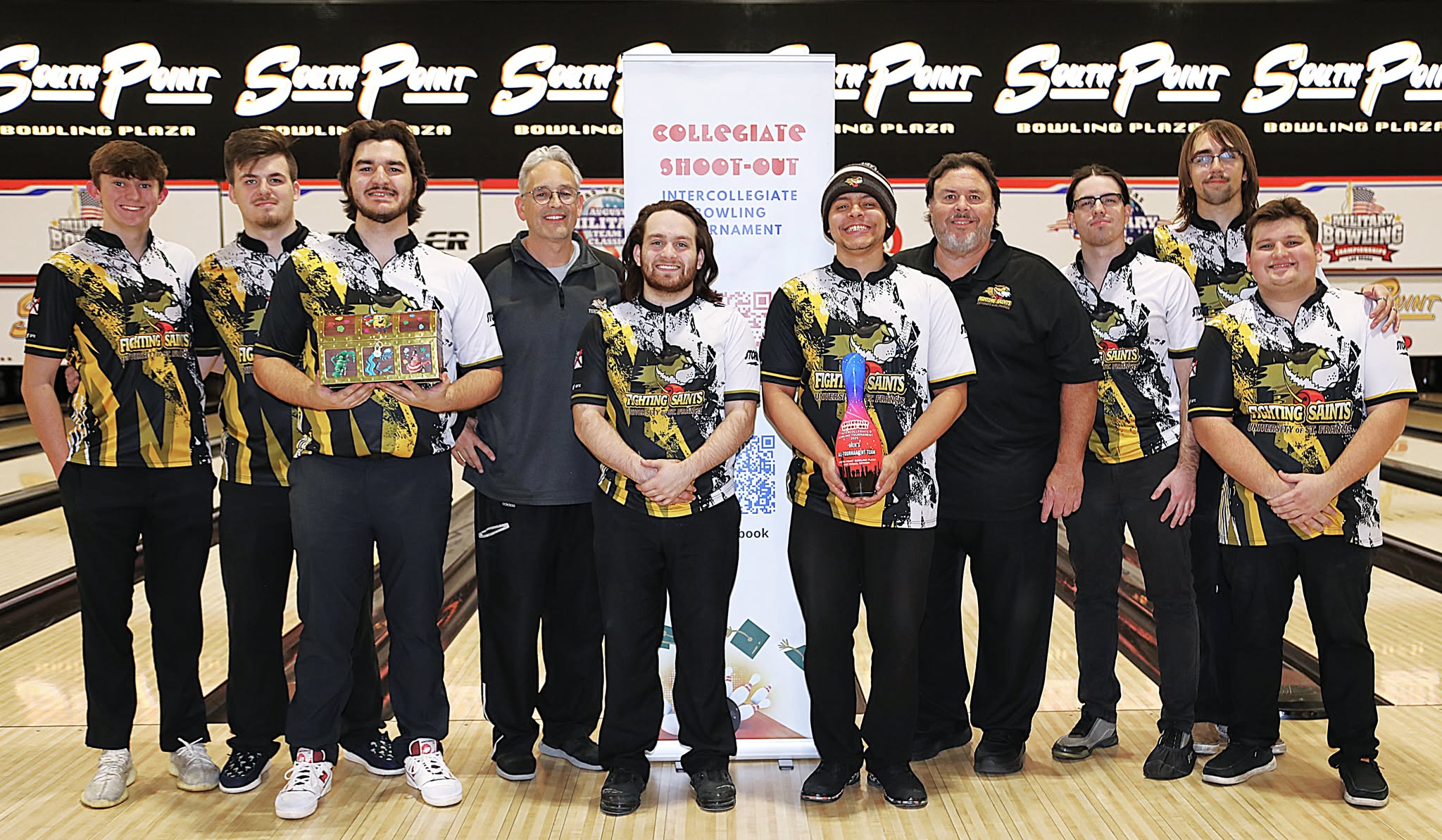| University of St. Francis (IL) Fighting Saints Trevor Anifer, Chris Bald, Jacob Gunther, Coach Tony Talley, Gabe Mejia-Wick, Jalen Pfaff, Coach Mike Nape, Dylan Holtz, Avram Savage, Anthony Lizzio |